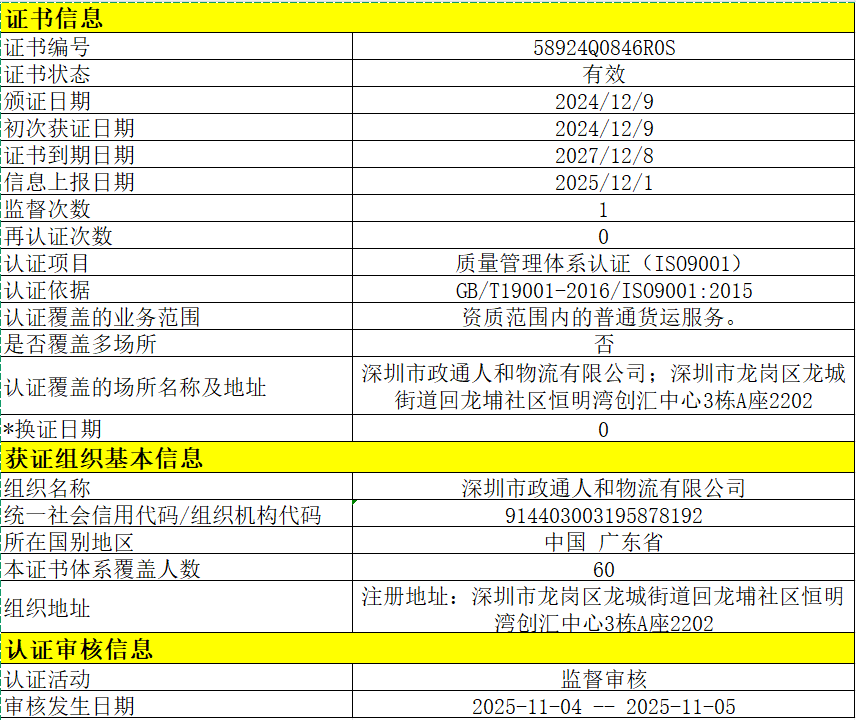 深圳市政通人和物流有限公司 58924Q0846R0S