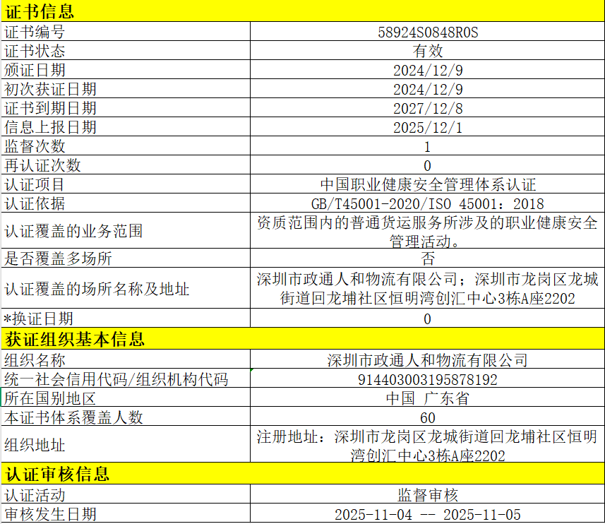 深圳市政通人和物流有限公司 58924S0848R0S