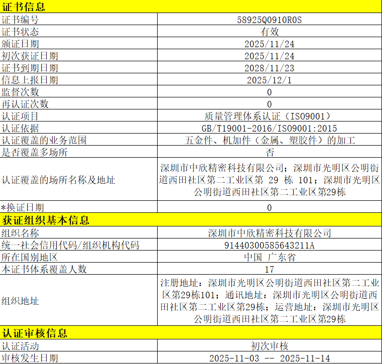 深圳市中欣精密科技有限公司 58925Q0910R0S