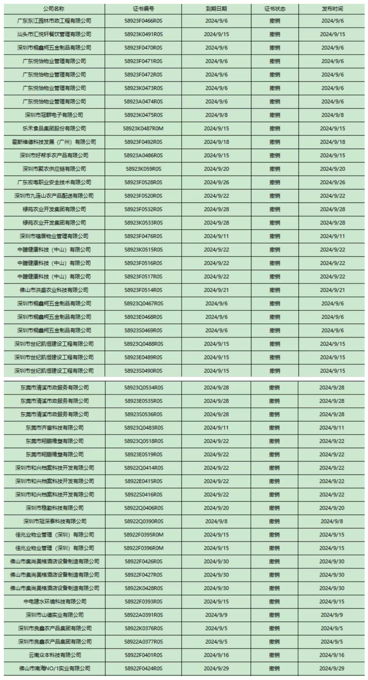 2024年9月暫停撤銷(xiāo)失效證書(shū)清單