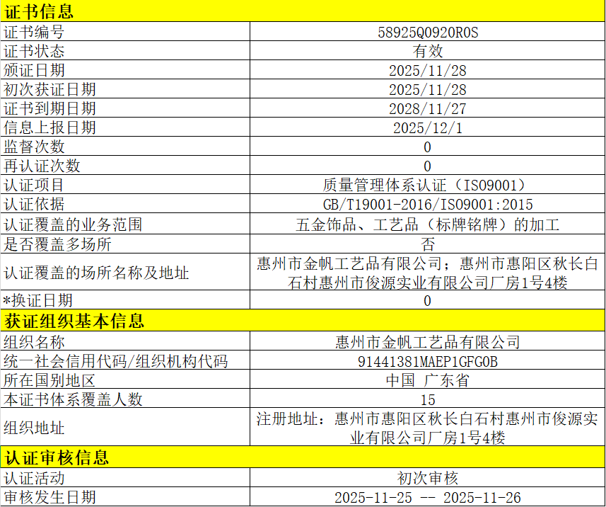 惠州市金帆工藝品有限公司 58925Q0920R0S